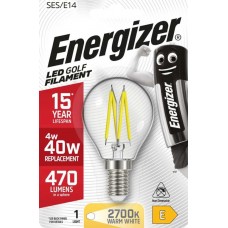 This is a 4W filament LED Golf Ball shaped light bulb with a Small Edison Screw / SES / E14 cap and looks and feels just like a standard glass incandescent light bulb. This 4W filament LED bulb is a replacement for a 40W tungsten filament incandescent golf ball shaped light bulb.