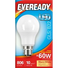 This is a premium, high quality and compact Eveready LED GLS (A60) shaped lamp / light bulb with a Bayonet / BC / B22 cap / base and provides a Warm White White / 830 / 3000K light. These Eveready LED light bulbs use just 9.6w of electricity but produce the same amount of light as a 60w incandescent light bulb.