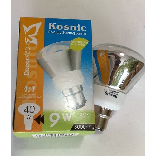 This is a high quality R63 Bayonet / B22 / BC Low Energy Saving 9w (40w) warm white 2700K reflector light bulb / spotlight / lamp made by Kosnic and is made from glass and Amalgam technology.